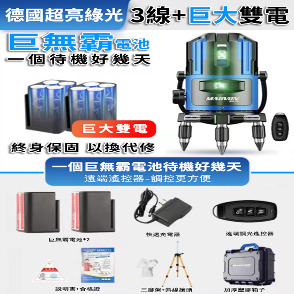 4分鐘前熱銷破萬件!戶外清晰可見【德國MAOVON】歐司朗綠光2/3/5線鐳射儀 - 【3線】巨大雙電+三腳架 +遙控 NT$3250