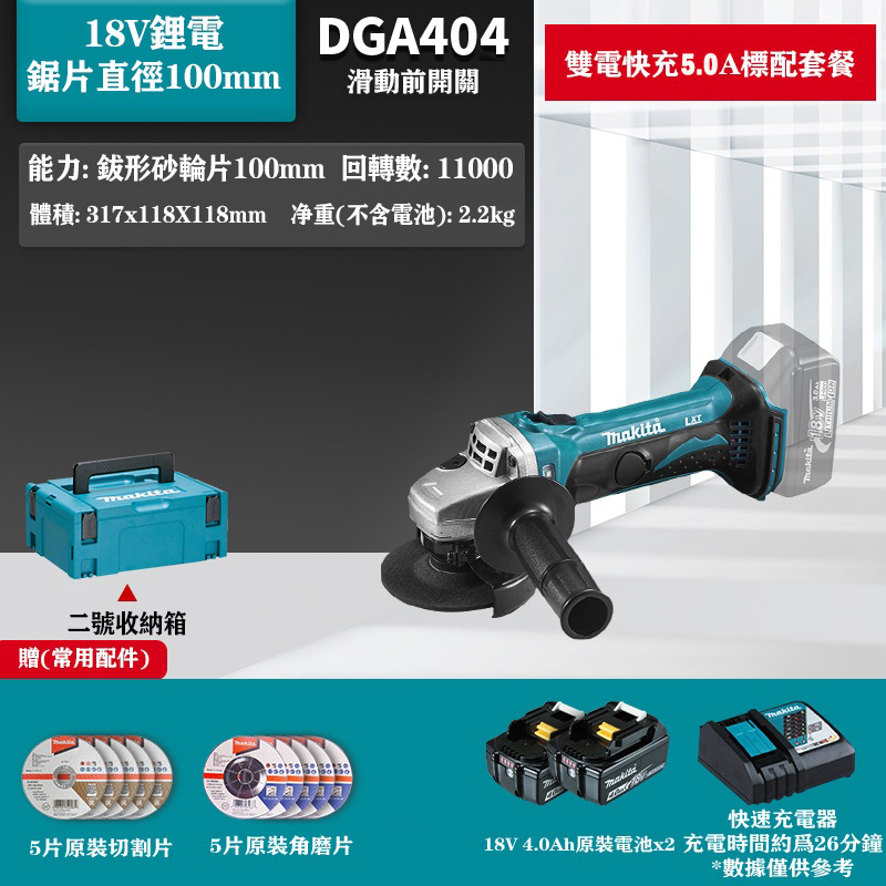 12分鐘前【Makita/牧田】DGA404 18V充電式砂輪機,變速!是同類產品中最安靜的角磨機之一 - 18V鋰電雙電快充5.0Ah組